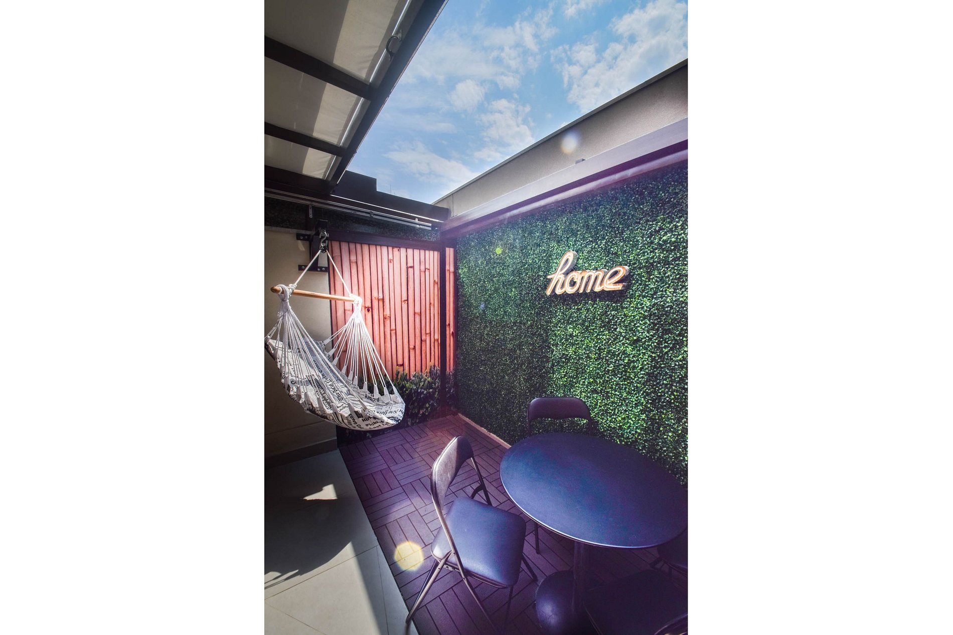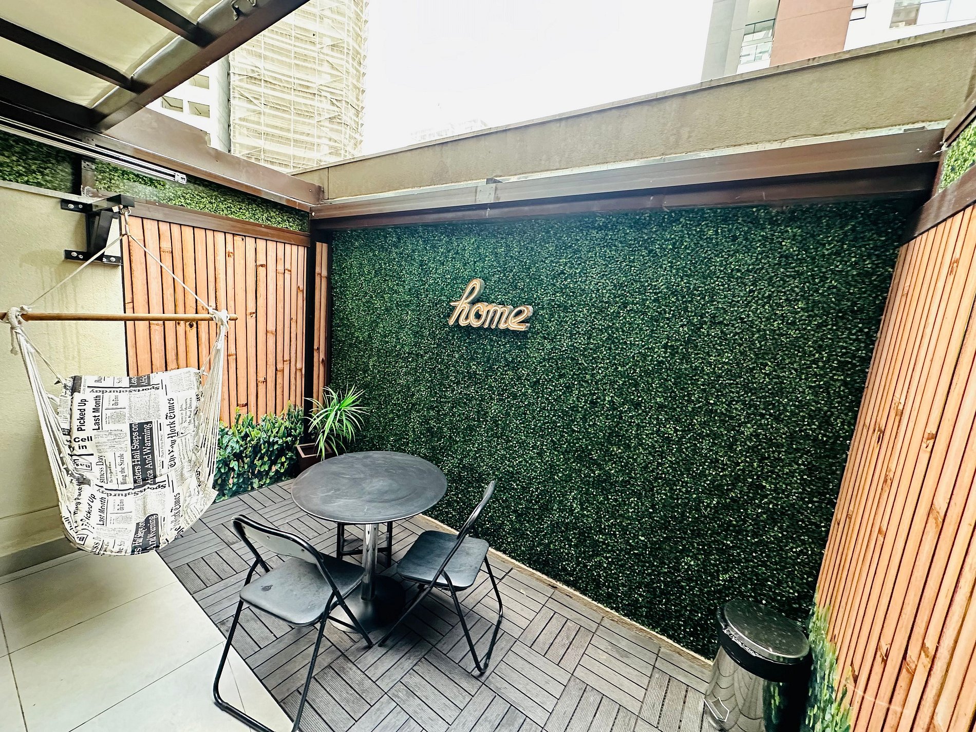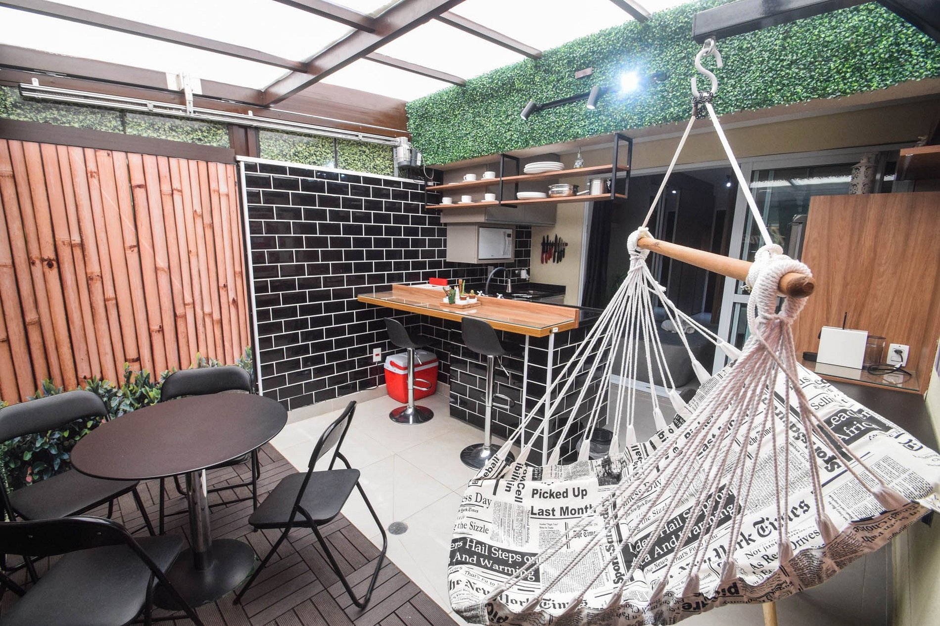 Apartamento garden com teto retrátil elétrico , linda decoração, cadeira suspensa , completo com cozinha gourmet ,máquina lava e seca, ar condicionado, filtro d água , cafeteira Nespresso, microondas, Smart TV 43 polegadas,Forno elétrico , fogão Coocktop, forno , Geladeira frostfree inox ,cama Queen Size , sofá cama de casal , secador de cabelo , mesa de trabalho e mesa de refeições,Tomadas USB,utensílios de cozinha, cortina blackout,roupa de cama e banho,internet de alta velocidade ideal para home office