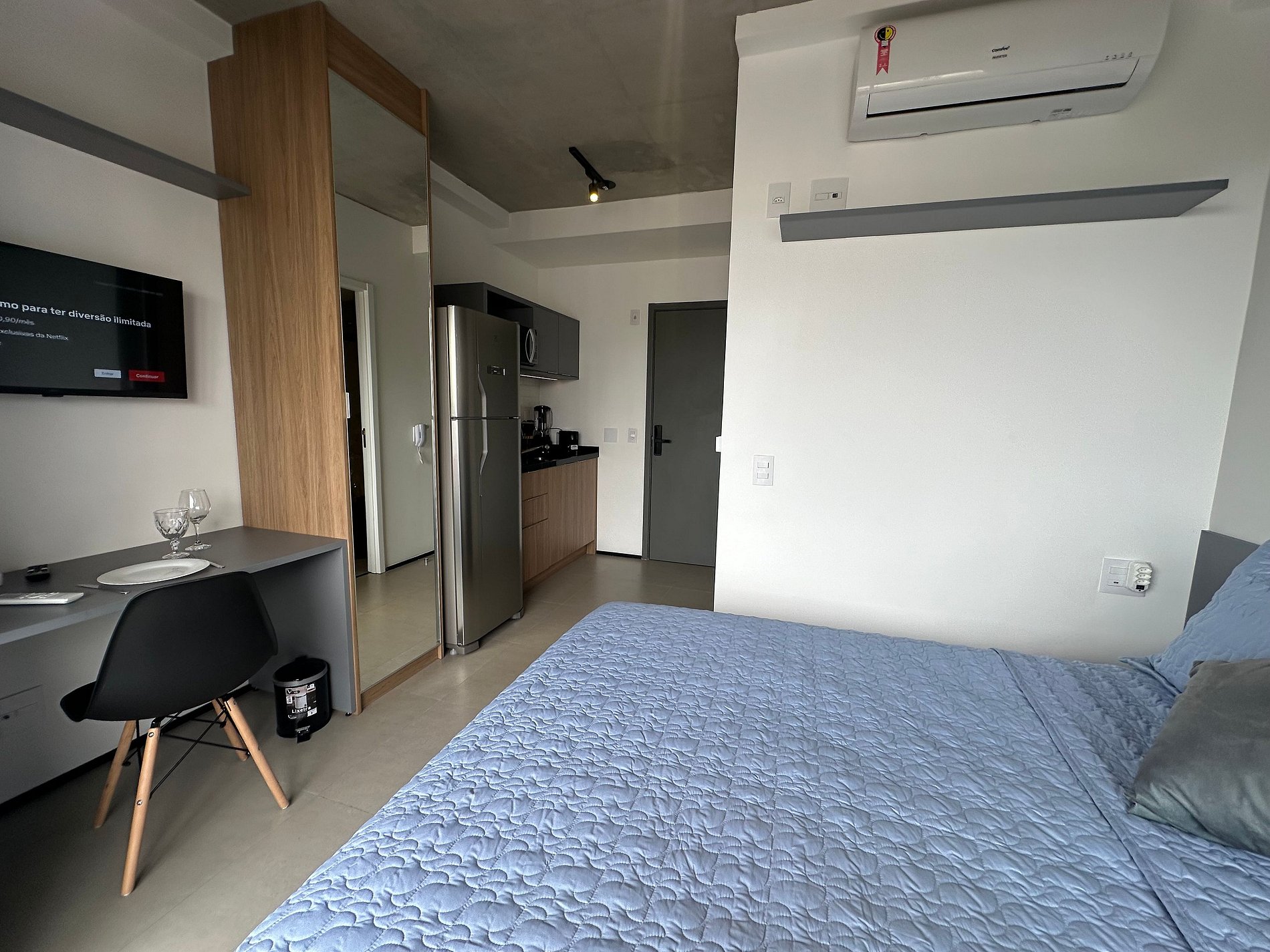 Condomínio moderno com piscina de borda infinita no rooftop top , academia , lavanderia , espaço de trabalho , diversos ambientes modernos e aconchegantes para você poder trabalhar home office . Apartamento fica no 14 andar, possui um a linda vista panorâmica para a cidade de São Paulo, ar condicionado, internet de alta velocidade, geladeira , fogão , Air fryer , cafeteira Nespresso , ferro e tábua de passar, liquidificador, sanduicheira , secador de cabelo , utensílios de cozinha.